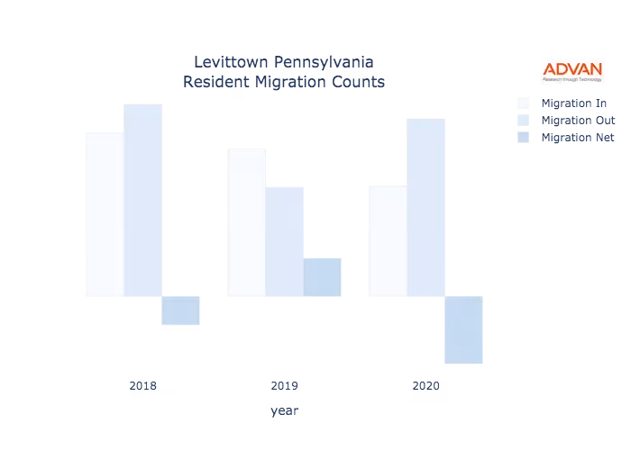 The charts below graph the inbound, outbound and net migration to the city of Levittown, PA for each year of data available. Data displayed on the charts is annually aggregated; the REPerspectives product allows analysis of mobility trends with monthly granularity by State, Zip, County and Census Block Group.