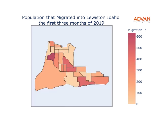 The map below shows the migration into Lewiston, ID by Census Block Group (CBG).