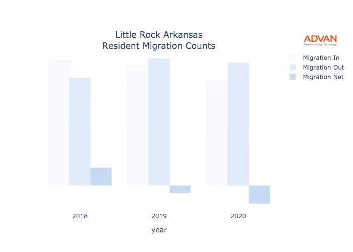 The charts below graph the inbound, outbound and net migration to the city of Little Rock, AR for each year of data available. Data displayed on the charts is annually aggregated; the REPerspectives product allows analysis of mobility trends with monthly granularity by State, Zip, County and Census Block Group.
