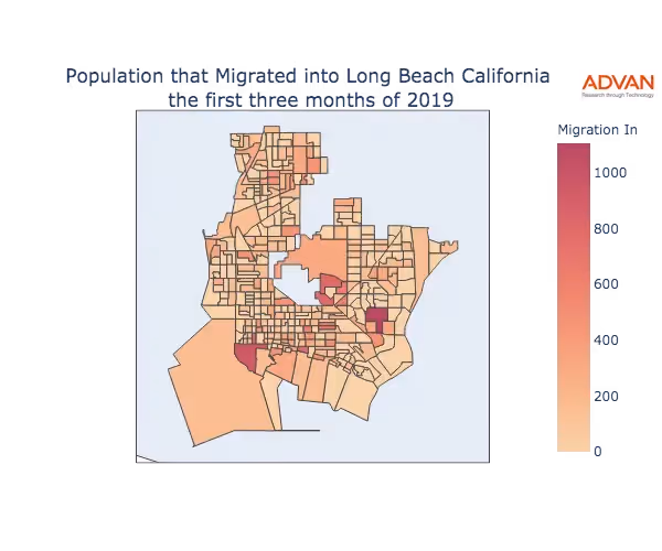 The map below shows the migration into Long Beach, CA by Census Block Group (CBG).