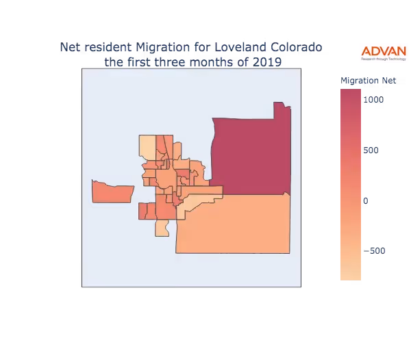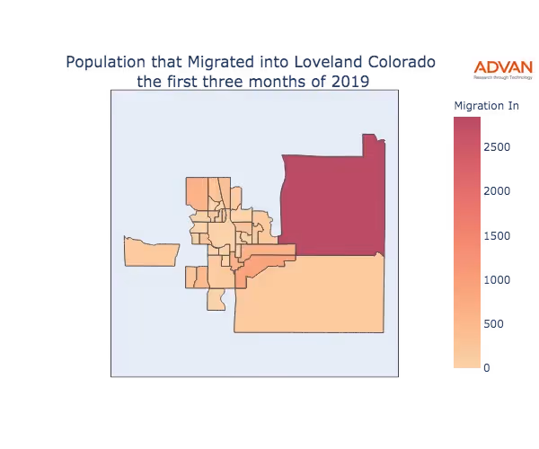 The map below shows the migration into Loveland, CO by Census Block Group (CBG).
