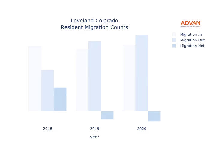 The charts below graph the inbound, outbound and net migration to the city of Loveland, CO for each year of data available. Data displayed on the charts is annually aggregated; the REPerspectives product allows analysis of mobility trends with monthly granularity by State, Zip, County and Census Block Group.