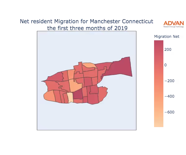 The map below shows the migration into Manchester, CT by Census Block Group (CBG).