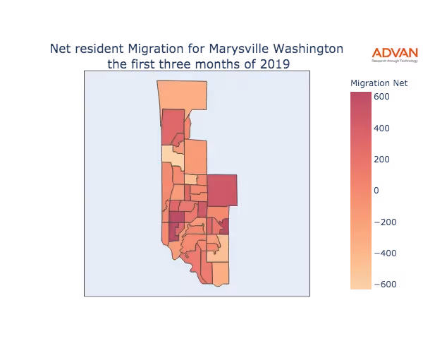 The map below shows the migration into Marysville, WA by Census Block Group (CBG).
