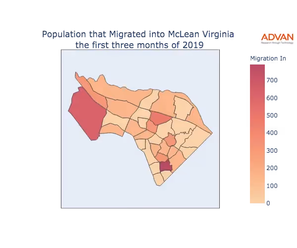 The map below shows the migration into McLean, VA by Census Block Group (CBG).
