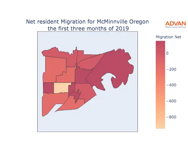The map below shows the migration into McMinnville, OR by Census Block Group (CBG).