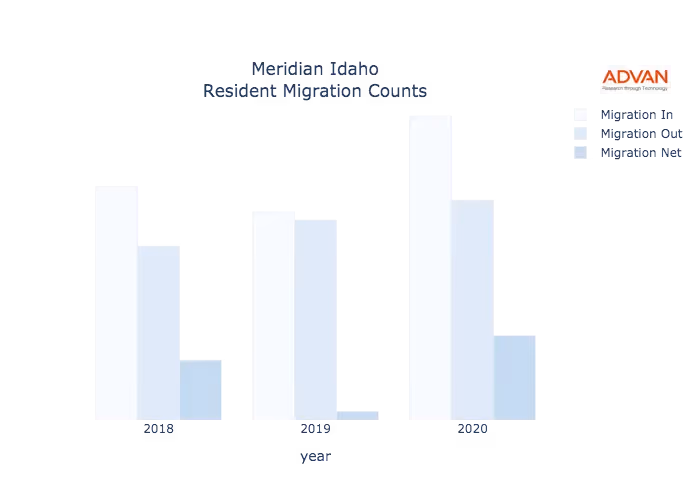 The charts below graph the inbound, outbound and net migration to the city of Meridian, ID for each year of data available. Data displayed on the charts is annually aggregated; the REPerspectives product allows analysis of mobility trends with monthly granularity by State, Zip, County and Census Block Group.