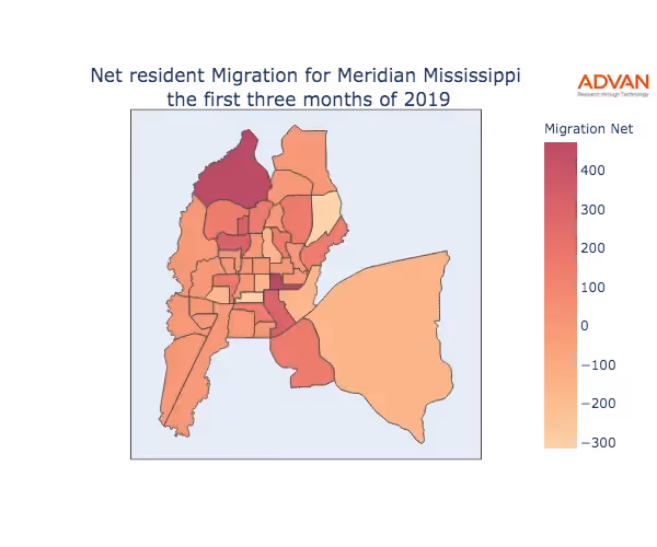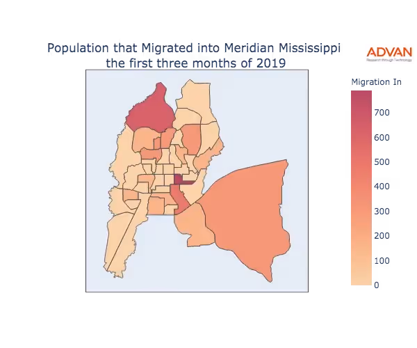 The map below shows the migration into Meridian, MS by Census Block Group (CBG).