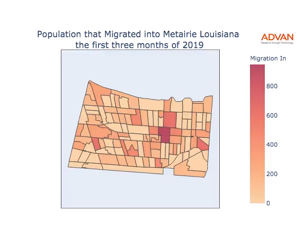 The map below shows the migration into Metairie, LA by Census Block Group (CBG).
