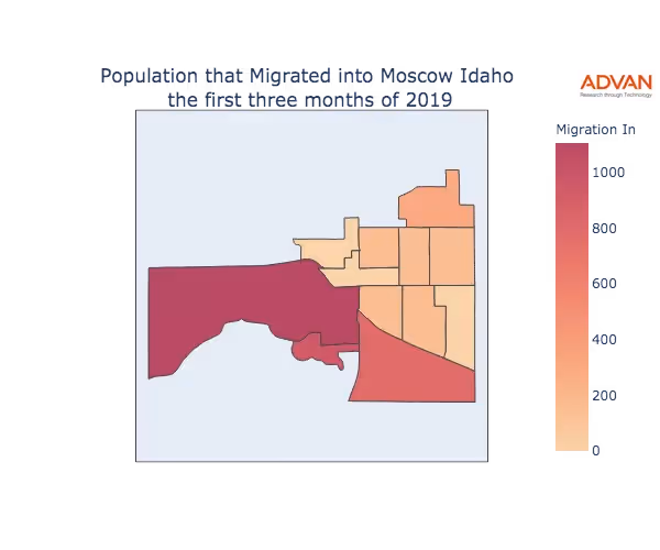 The map below shows the migration into Moscow, ID by Census Block Group (CBG).