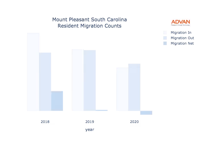 The charts below graph the inbound, outbound and net migration to the city of Mount Pleasant, SC for each year of data available. Data displayed on the charts is annually aggregated; the REPerspectives product allows analysis of mobility trends with monthly granularity by State, Zip, County and Census Block Group.