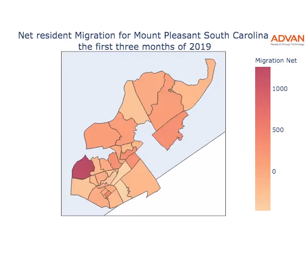 The map below shows the migration into Mount Pleasant, SC by Census Block Group (CBG).
