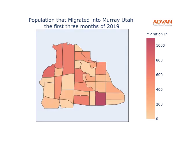 The map below shows the migration into Murray, UT by Census Block Group (CBG).
