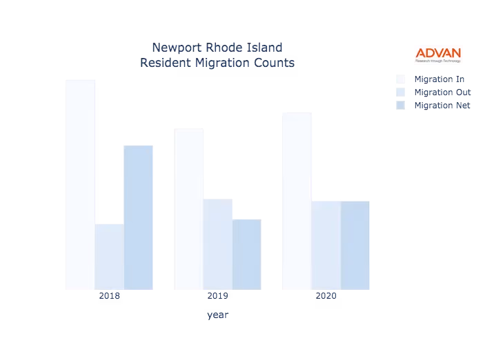 The charts below graph the inbound, outbound and net migration to the city of Newport, RI for each year of data available. Data displayed on the charts is annually aggregated; the REPerspectives product allows analysis of mobility trends with monthly granularity by State, Zip, County and Census Block Group.