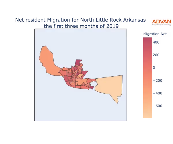The map below shows the migration into North Little Rock, AR by Census Block Group (CBG).