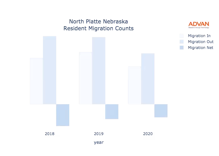The charts below graph the inbound, outbound and net migration to the city of North Platte, NE for each year of data available. Data displayed on the charts is annually aggregated; the REPerspectives product allows analysis of mobility trends with monthly granularity by State, Zip, County and Census Block Group.