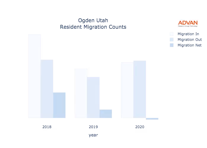 The charts below graph the inbound, outbound and net migration to the city of Ogden, UT for each year of data available. Data displayed on the charts is annually aggregated; the REPerspectives product allows analysis of mobility trends with monthly granularity by State, Zip, County and Census Block Group.