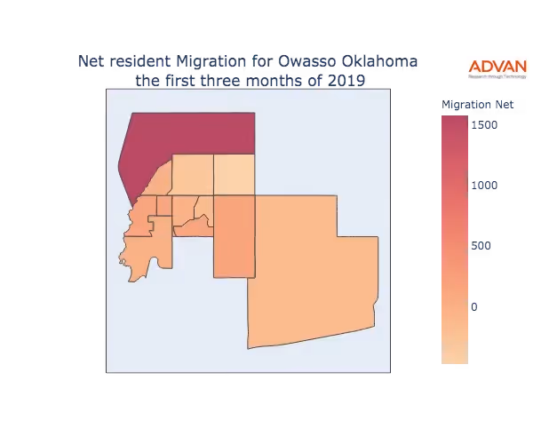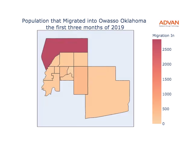 The map below shows the migration into Owasso, OK by Census Block Group (CBG).