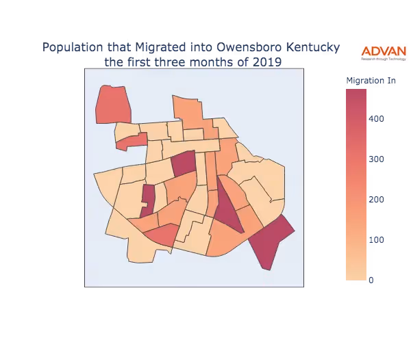 The map below shows the migration into Owensboro, KY by Census Block Group (CBG).