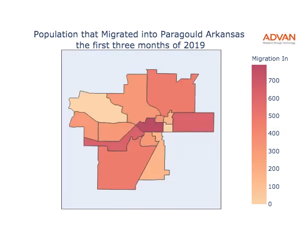 The map below shows the migration into Paragould, AR by Census Block Group (CBG).