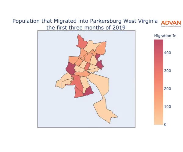 The map below shows the migration into Parkersburg, WV by Census Block Group (CBG).