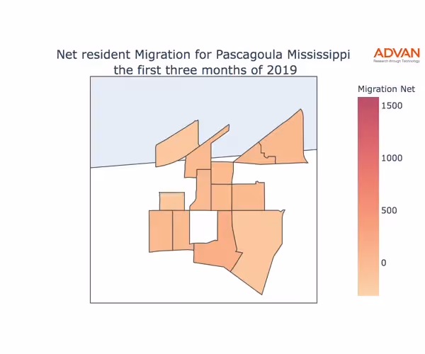 The map below shows the migration into Pascagoula, MS by Census Block Group (CBG).