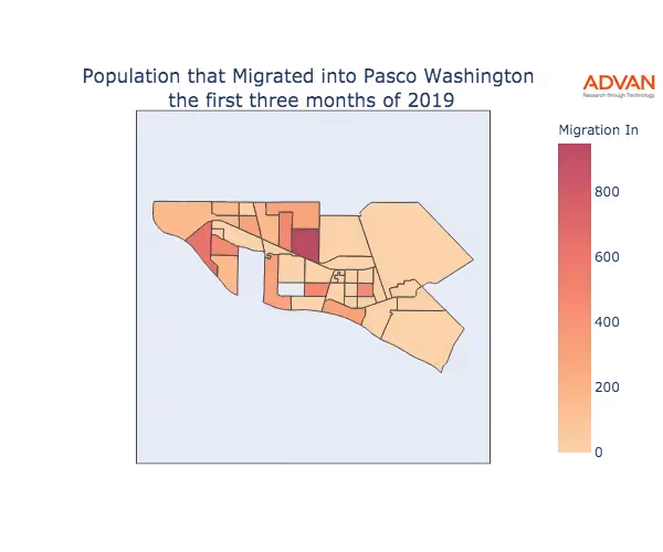The map below shows the migration into Pasco, WA by Census Block Group (CBG).