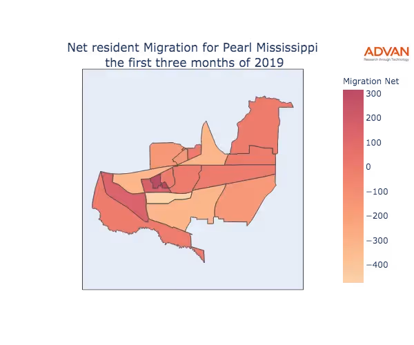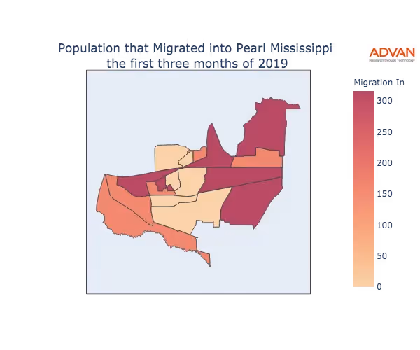 The map below shows the migration into Pearl, MS by Census Block Group (CBG).