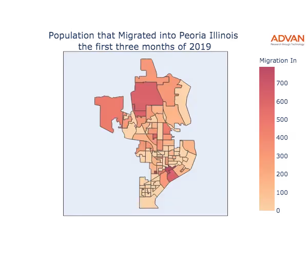 The map below shows the migration into Peoria, IL by Census Block Group (CBG).