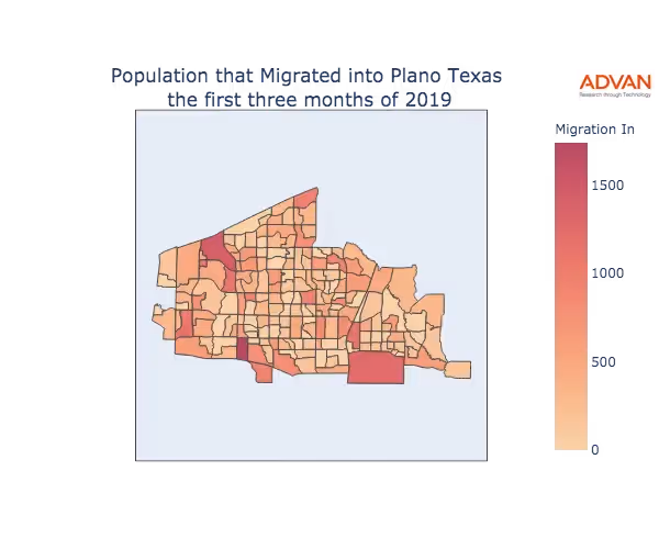 The map below shows the migration into Plano, TX by Census Block Group (CBG).