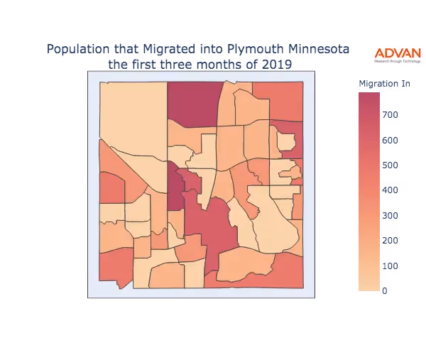 The map below shows the migration into Plymouth, MN by Census Block Group (CBG).