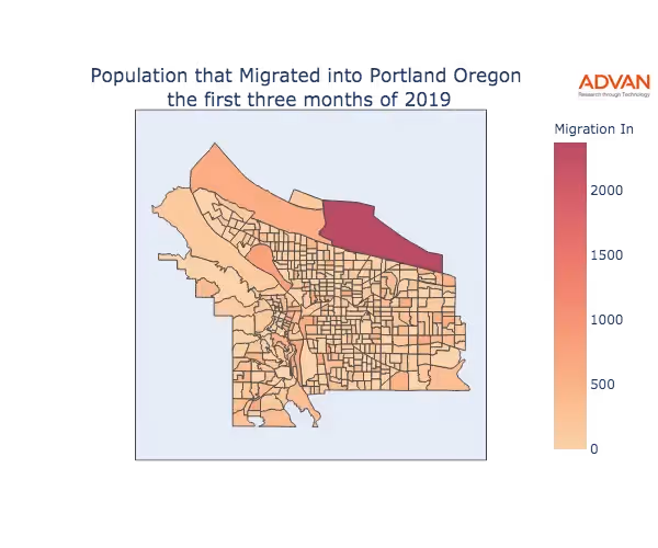 The map below shows the migration into Portland, OR by Census Block Group (CBG).