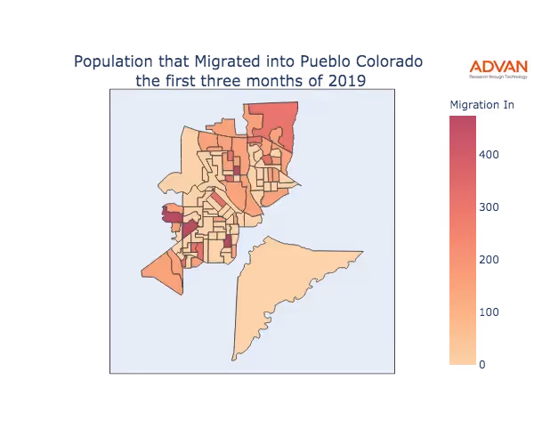 The map below shows the migration into Pueblo, CO by Census Block Group (CBG).