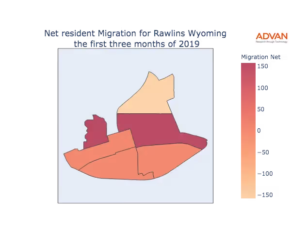 The map below shows the migration into Rawlins, WY by Census Block Group (CBG).