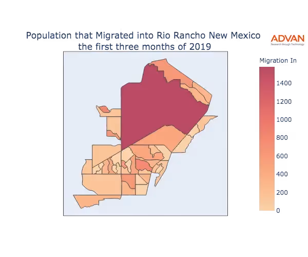 The map below shows the migration into Rio Rancho, NM by Census Block Group (CBG).