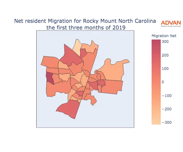 The map below shows the migration into Rocky Mount, NC by Census Block Group (CBG).
