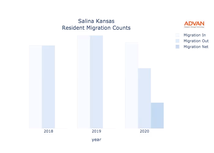 The charts below graph the inbound, outbound and net migration to the city of Salina, KS for each year of data available. Data displayed on the charts is annually aggregated; the REPerspectives product allows analysis of mobility trends with monthly granularity by State, Zip, County and Census Block Group.