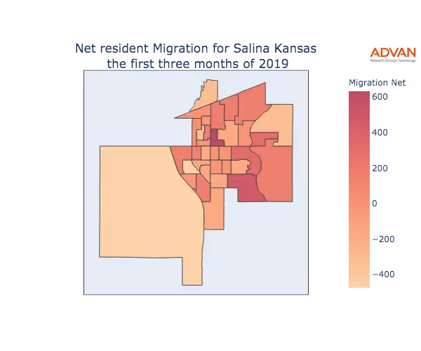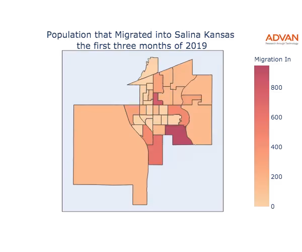 The map below shows the migration into Salina, KS by Census Block Group (CBG).