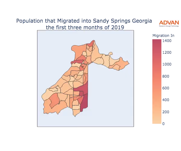 The map below shows the migration into Sandy Springs, GA by Census Block Group (CBG).