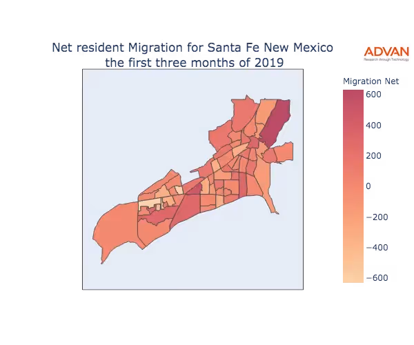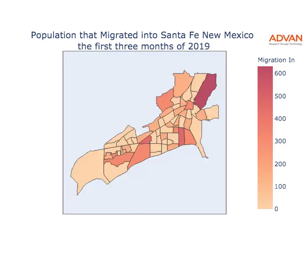 The map below shows the migration into Santa Fe, NM by Census Block Group (CBG).