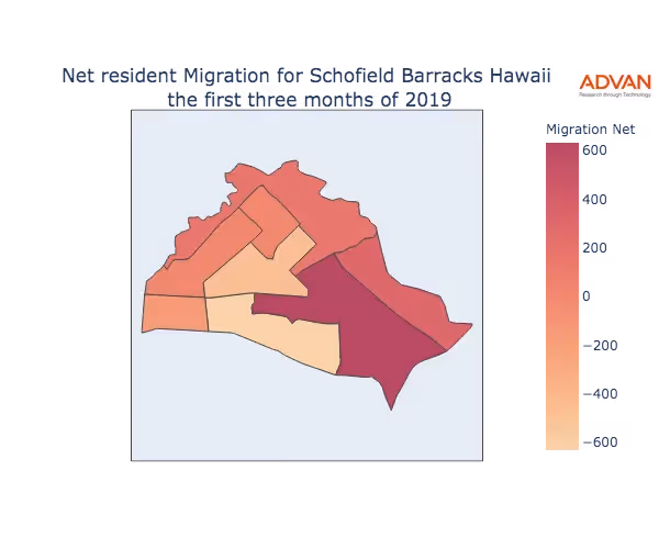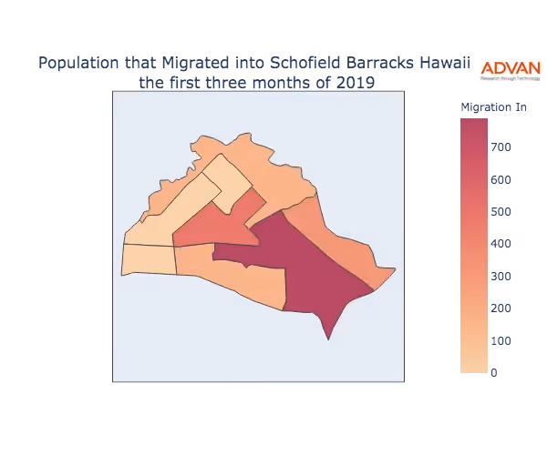The map below shows the migration into Schofield Barracks, HI by Census Block Group (CBG).