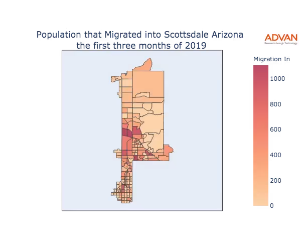 The map below shows the migration into Scottsdale, AZ by Census Block Group (CBG).