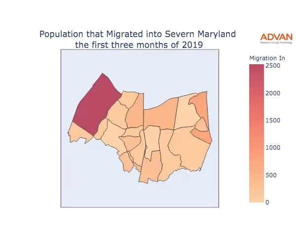 The map below shows the migration into Severn, MD by Census Block Group (CBG).