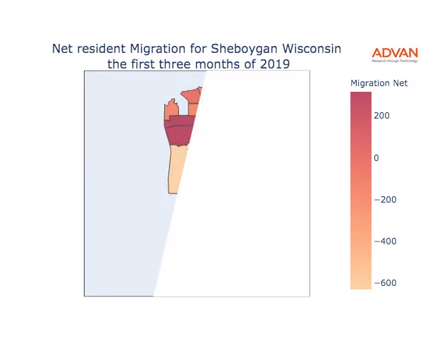 The map below shows the migration into Sheboygan, WI by Census Block Group (CBG).