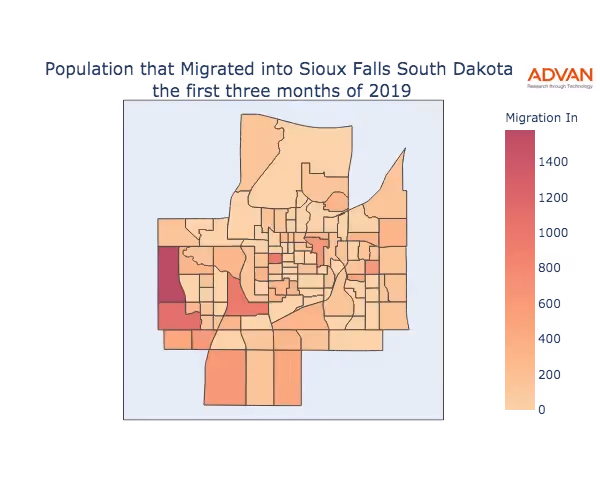 The map below shows the migration into Sioux Falls, SD by Census Block Group (CBG).