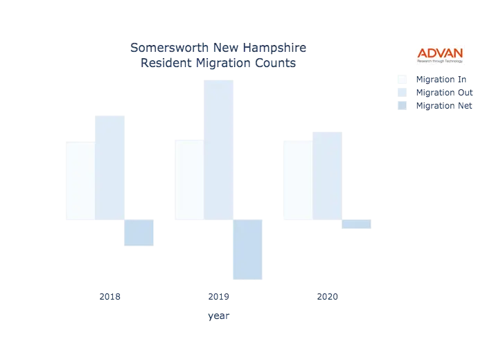 The charts below graph the inbound, outbound and net migration to the city of Somersworth, NH for each year of data available. Data displayed on the charts is annually aggregated; the REPerspectives product allows analysis of mobility trends with monthly granularity by State, Zip, County and Census Block Group.