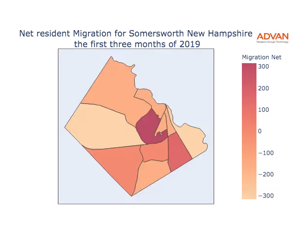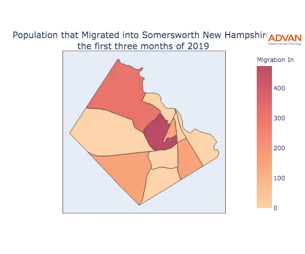 The map below shows the migration into Somersworth, NH by Census Block Group (CBG).