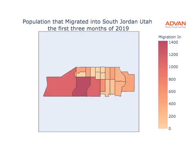 The map below shows the migration into South Jordan, UT by Census Block Group (CBG).