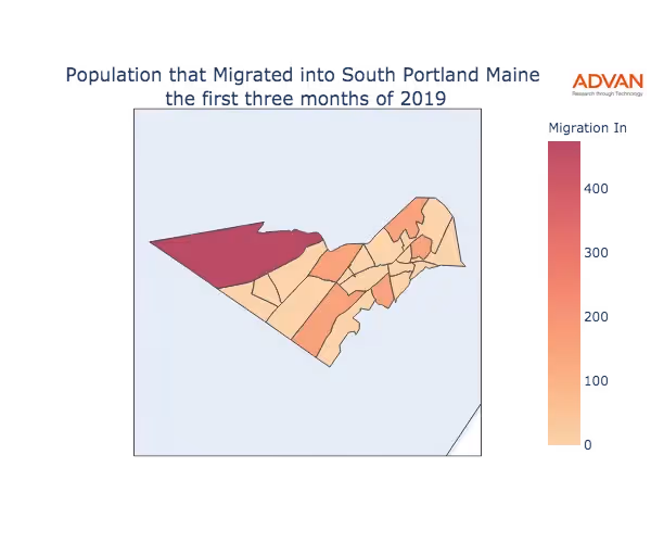 The map below shows the migration into South Portland, ME by Census Block Group (CBG).
