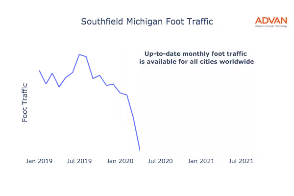 This shows the citywide foot traffic in Southfield, MI for the last few years.: